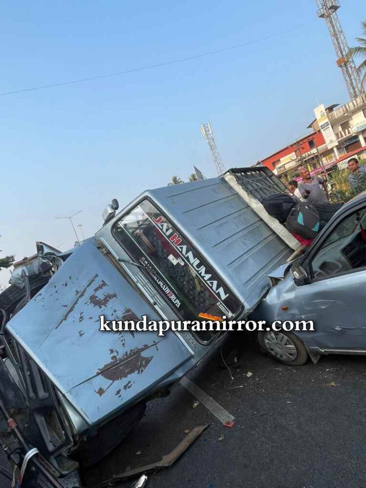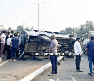 ಬ್ರಹ್ಮಾವರ ತಾಲೂಕಿನ ಕೋಟ ಬಸ್ ನಿಲ್ದಾಣ ಸಮೀಪ ತೂಪನ್ ವಾಹನದ ಟೈಯರ್ ಏಕಾಏಕಿ ಸ್ಫೋಟಗೊಂಡು ಚಾಲಕನ ನಿಯಂತ್ರಣ ತಪ್ಪಿದೆ. ಪರಿಣಾಮ ವಾಹನ ಡಿವೈಡರ್ ಹಾರಿ, ವಿರುದ್ಧ ದಿಕ್ಕಿನಲ್ಲಿ ಬರುತ್ತಿದ್ದ ಎರಡು ಕಾರುಗಳಿಗೆ ಡಿಕ್ಕಿ ಹೊಡೆದು ಕಾರಿನ ಮೇಲೆಯೇ ಪಲ್ಟಿ ಹೊಡೆದಿದೆ.