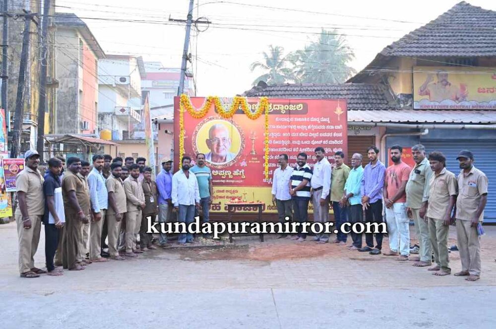 ಕುಂದಾಪುರ: ಅಲ್ಪಕಾಲದ ಅನಾರೋಗ್ಯದಿಂದ ನಿಧನರಾದ ಬಸ್ರೂರು ಅಪ್ಪಣ್ಣ ಹೆಗ್ಡೆ ಸ್ಮರಣಾರ್ಥವಾಗಿ ಕುಂದಾಪುರ ಗುರುಜ್ಯೋತಿ ಜ್ಯೂಸ್ ಸೆಂಟರ್ ಮುಂಭಾಗದಲ್ಲಿ ಅವರ ಭಾವ ಚಿತ್ರಕ್ಕೆ ಪುಷ್ಪನಮನ ಸಲ್ಲಿಸುವ ಮೂಲಕ ಮಾಲೀಕ ನರಸಿಂಹ ಪೂಜಾರಿ ಮತ್ತು ಸತೀಶ್ ಪೂಜಾರಿ ಶೃದ್ದಾಂಜಲಿ ಸಲ್ಲಿಸಿದರು. ಜೊತೆಗೆ ಕುಂದಾಪುರದ ಪುರಸಭೆ ಪೌರ ಕಾರ್ಮಿಕರು ದೀಪ ಬೆಳಗಿಸಿ ಅಗಲಿದ ಚೇತನಕ್ಕೆ ನಮನ ಸಲ್ಲಿಸಿದರು.
