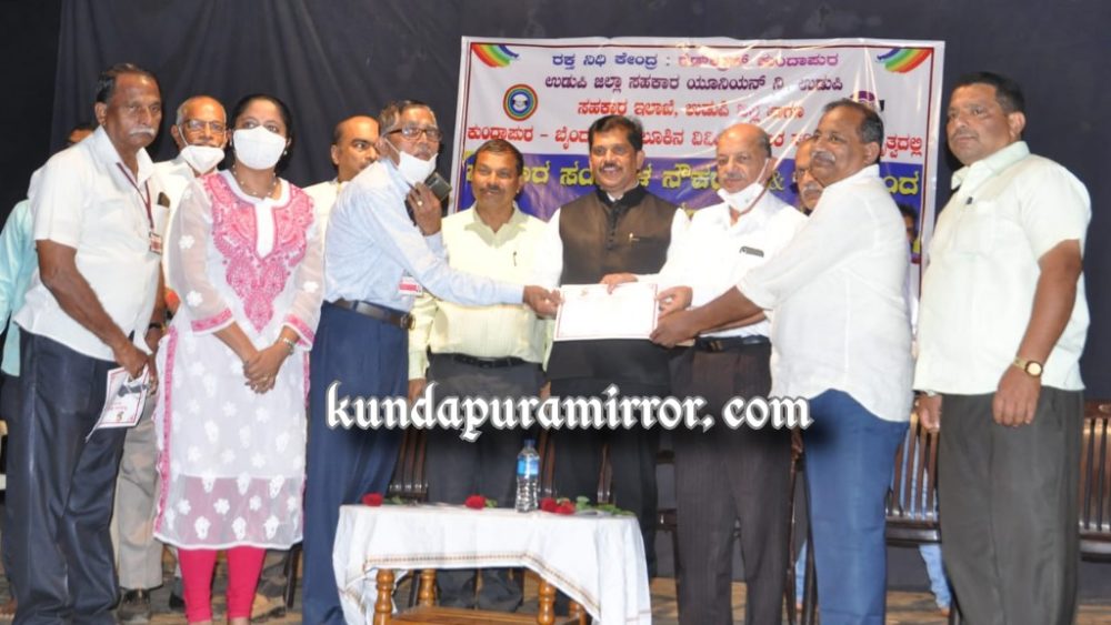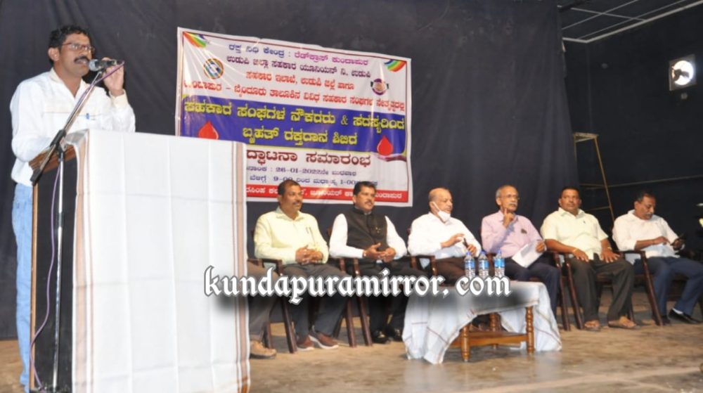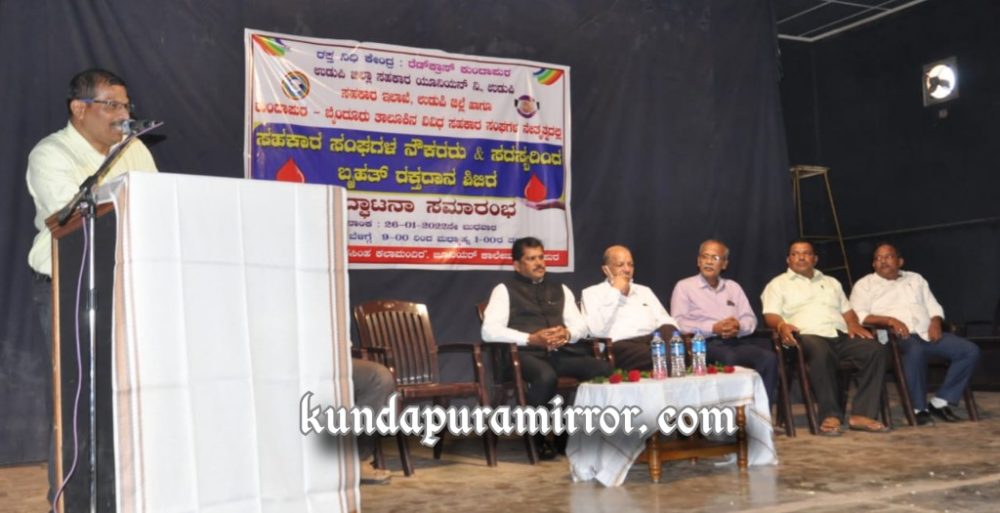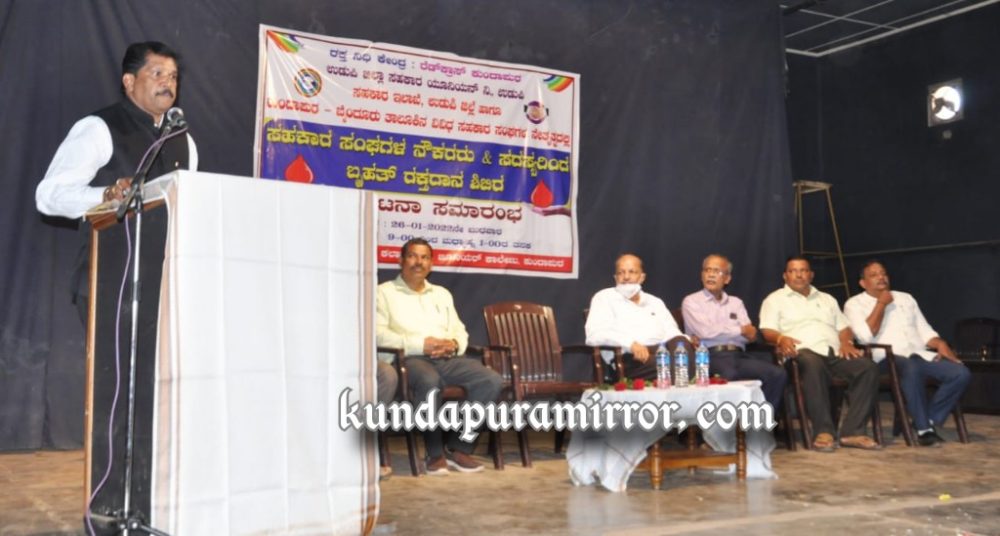 ಅವರು ಬುಧವಾರ ಕುಂದಾಪುರದ ಜೂನಿಯರ್ ಕಾಲೇಜಿನ ಶ್ರೀ ಲಕ್ಷ್ಮಿ ನರಸಿಂಹ ಕಲಾ ಮಂದಿರದಲ್ಲಿ ಕುಂದಾಪುರ ರೆಡ್ಕ್ರಾಸ್ನ ರಕ್ತನಿಧಿ ಕೇಂದ್ರ, ಉಡುಪಿ ಜಿಲ್ಲಾ ಸಹಕಾರ ಯೂನಿಯನ್, ಸಹಕಾರ ಇಲಾಖೆ ಉಡುಪಿ ಹಾಗೂ ಕುಂದಾಪುರ ಮತ್ತು ಬೈಂದೂರು ತಾಲೂಕಿನ ವಿವಿಧ ಸಹಕಾರಿ ಸಂಘಗಳ ನೇತೃತ್ವದಲ್ಲಿ ಆಯೋಜಿಸಿದ ಸಹಕಾರ ಸಂಘಗಳ ನೌಕರರು ಹಾಗೂ ಸದಸ್ಯರಿಂದ ಬೃಹತ್ ರಕ್ತದಾನ ಶಿಬಿರದ ಅಧ್ಯಕ್ಷತೆ ವಹಿಸಿ ಮಾತನಾಡಿದರು.