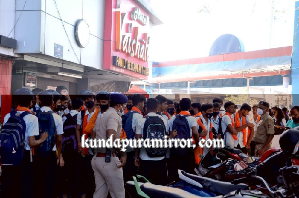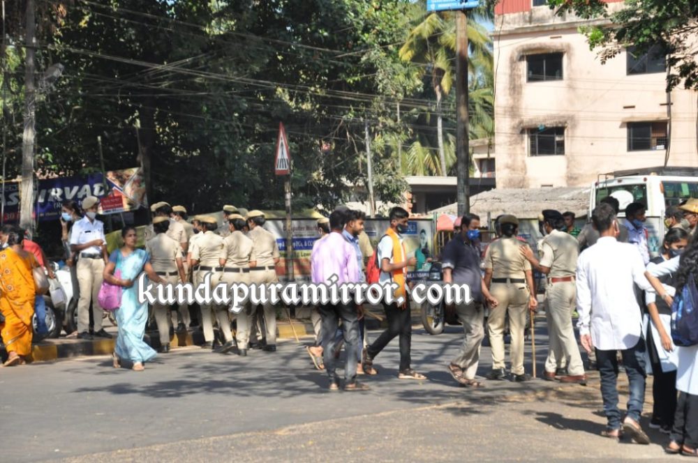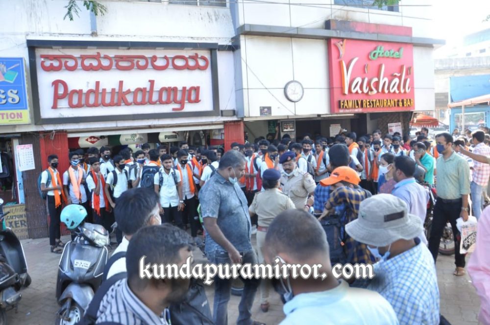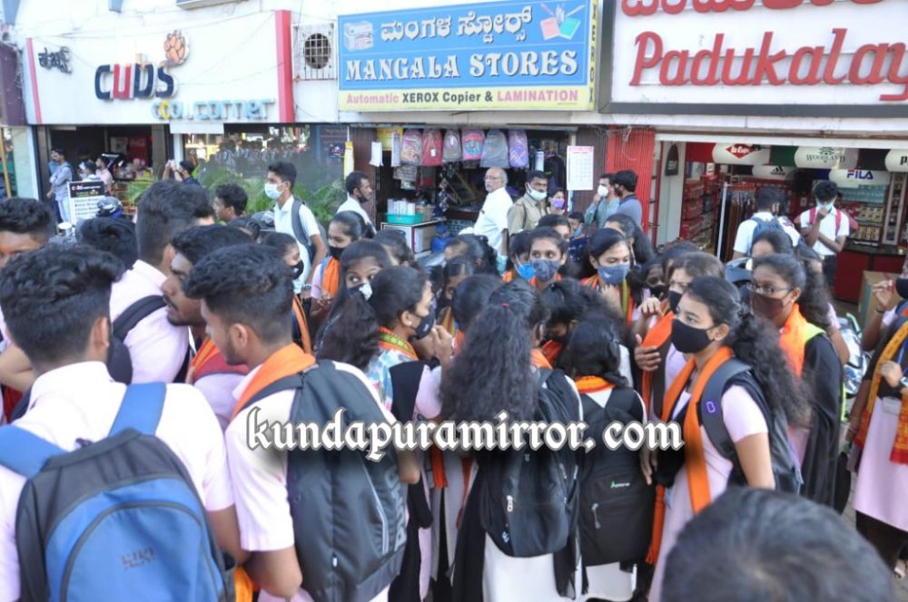 ಶನಿವಾರ ಬೆಳ್ಳಂಬೆಳಿಗ್ಗೆ ಸ್ಥಳೀಯ ಆರ್.ಎನ್.ಶೆಟ್ಟಿ ಪದವಿ ಪೂರ್ವ ಕಾಲೇಜಿನಲ್ಲಿ ಹಿಜಾಬ್ ಧರಿಸಿದ ವಿದ್ಯಾರ್ಥಿನಿಯರನ್ನು ಒಳಬಿಟ್ಟಿದ್ದರೆಂದು ಕೆಲವು ವಿದ್ಯಾರ್ಥಿಗಳು ಆಕ್ರೋಶ ವ್ಯಕ್ತ ಪಡಿಸಿದ ಹಿನ್ನೆಲೆಯಲ್ಲಿ ಕಾಲೇಜಿಗೆ ರಜೆ ಘೋಷಿಸಲಾಯಿತು. ಕಾಲೇಜಿನಿಂದ ಹೊರಬಂದ ವಿದ್ಯಾರ್ಥಿಗಳು ಕೇಸರಿ ಶಾಲು ಧರಿಸಿ ಕುಂದಾಪುರ ಶಾಸ್ತ್ರೀವೃತ್ತದ ತನಕ ಘೋಷಣೆ ಕೂಗುತ್ತಾ ಬಂದರು.