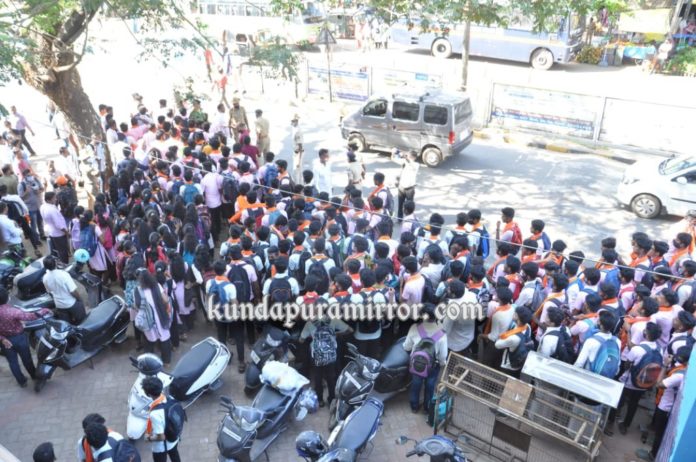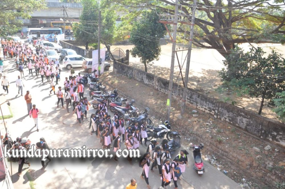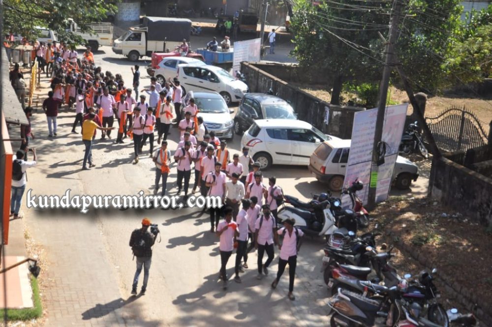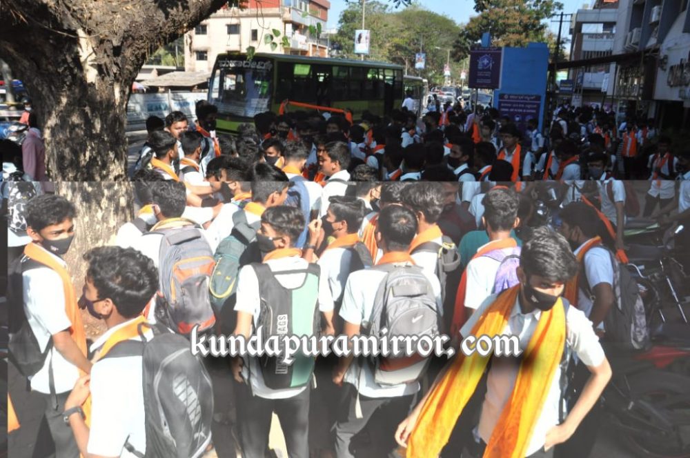 ಇತ್ತ ಭಂಡಾರ್ ಕಾರ್ಸ್ ಕಾಲೇಜಿನ ವಿದ್ಯಾರ್ಥಿಗಳು ಕೇಸರಿ ಶಾಲು ಧರಿಸಿ ಕುಂದೇಶ್ವರ ದೇವಸ್ಥಾನದಿಂದ ಘೋಷಣೆ ಕೂಗುತ್ತಾ ಕಾಲೇಜಿನತ್ತ ಹೆಜ್ಜೆ ಹಾಕಿದರು. ದೊಡ್ಡ ಸಂಖ್ಯೆಯಲ್ಲಿ ವಿದ್ಯಾರ್ಥಿಗಳು ಜೈ ಶ್ರೀರಾಮ್ ಘೋಷಣೆಯೊಂದಿಗೆ ಮುಖ್ಯರಸ್ತೆಯಲ್ಲಿ ಸಾಗಿಬಂದು ಕಾಲೇಜಿನ ಆವರಣಕ್ಕೆ ಬಂದರು. ಕಾಲೇಜು ಆಡಳಿತ ಯಾವುದೇ ವಿದ್ಯಾರ್ಥಿಯೂ ಕೇಸರಿ ಶಾಲು, ಹಿಜಾಬ್ ಧರಿಸಿ ಕಾಲೇಜು ಆವರಣ ಪ್ರವೇಶ ಮಾಡಬಾರದೆಂದು ಸೂಚನೆ ನೀಡಿತ್ತು. ಪ್ರತಿಯೊಂದು ವಿದ್ಯಾರ್ಥಿಯನ್ನು ಕಾಲೇಜು ಸಿಬ್ಬಂದಿಗಳು ಗೇಟ್ ಹತ್ತಿರ ತೀವ್ರ ತಪಾಸಣೆ ಮಾಡಿಯೇ ಕಾಲೇಜು ಒಳ ಬಿಟ್ಟರು.