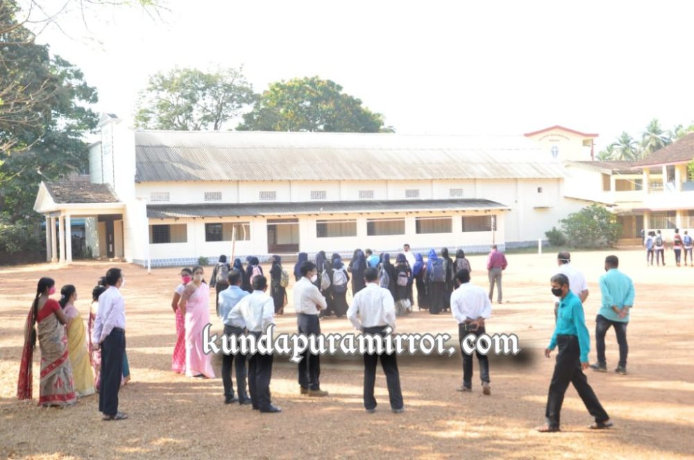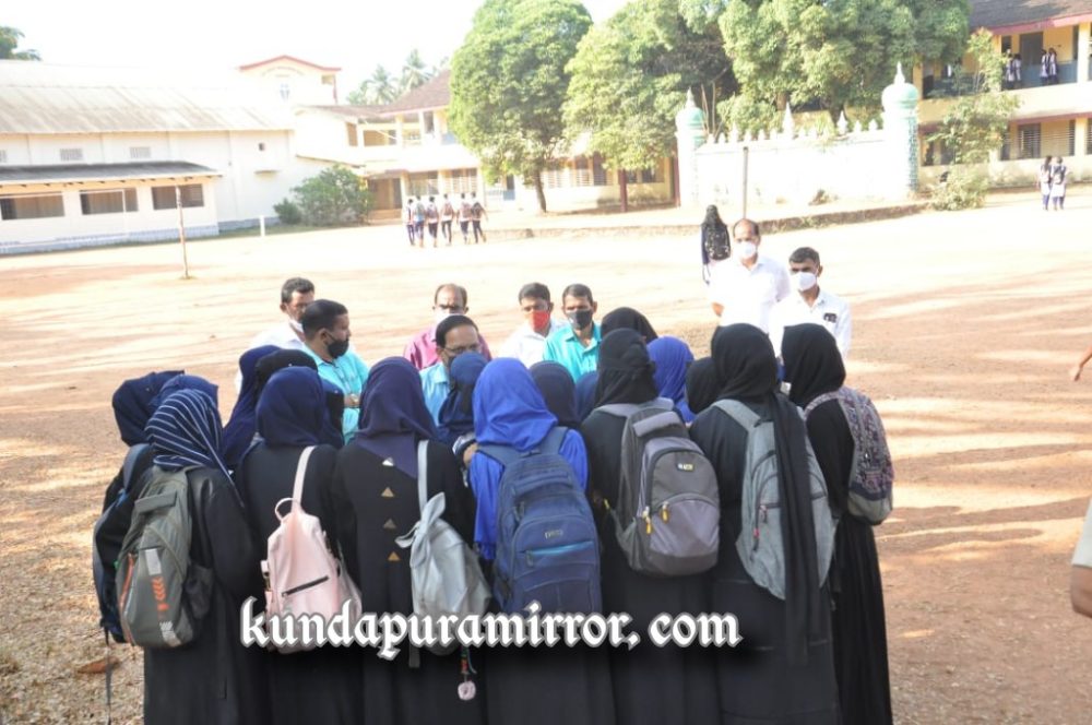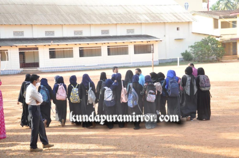 ಕುಂದಾಪುರ: ಕುಂದಾಪುರದಲ್ಲಿ ಕಳೆದ ನಾಲ್ಕು ದಿನಗಳಿಂದ ನಡೆಯುತ್ತಿರುವ ಹಿಜಾಬ್ ವಿವಾದ ಸೋಮವಾರವೂ ಮುಂದುವರಿದಿದ್ದು, ಕುಂದಾಪುರ ಸರ್ಕಾರಿ ಪಿಯು ಕಾಲೇಜು ವಿದ್ಯಾರ್ಥಿನಿಯರು ಎಂದಿನಂತೆ ಹಿಜಾಬ್ ಧರಿಸಿ ಬಂದಿದ್ದರು.
