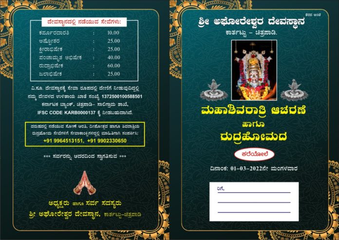 ಕೋಟ: ಶ್ರೀ ಅಘೋರೇಶ್ವರ ದೇವಸ್ಥಾನ ಕಾರ್ತಟ್ಟು ಚಿತ್ರಪಾಡಿಯಲ್ಲಿ ಮಹಾಶಿವರಾತ್ರಿ ಆಚರಣೆ ನಡೆಯಲಿದ್ದು ಆ ಪ್ರಯುಕ್ತ ರುದ್ರಹೋಮ,ರುದ್ರಾಭಿಷೇಕ ಹಾಗೂ ರಂಗಪೂಜಾದಿ ಧಾರ್ಮಿಕ ಕಾರ್ಯಕ್ರಮ ಜರುಗಲಿದ್ದು ಬೆಳ್ಳಿಗ್ಗೆ ಭಜನಾ ಕಾರ್ಯಕ್ರಮ ನಡೆಯಲಿದೆ .ಸಂಜೆ ದೇವಳದ ಸಭಾಂಗಣದಲ್ಲಿ ಧಾರ್ಮಿಕ ಸಭಾಕಾರ್ಯಕ್ರಮ ಜರುಗಲಿದ್ದು ಕುವೆಂಪು ವಿಶ್ವವಿದ್ಯಾನಿಲಯದ ಪಿ ಎಚ್ ಡಿ ಪುರಸೃತ ಡಾ.ಬಾಲಕೃಷ್ಣ ನಕ್ಷತ್ರಿ ಯವರಿಗೆ ಗೌರವ ಸಂಮಾನ ಕಾರ್ಯಕ್ರಮತದನಂತರ ಗಾನ ನೃತ್ಯ ವೈಭವ ಸಾಂಸ್ಕೃತಿಕ ಕಾರ್ಯಕ್ರಮ ಜರುಗಲಿದೆ ಎಂದು ದೇವಸ್ಥಾನ ದ ಆಡಳಿತ ಮಂಡಳಿ ಪತ್ರಿಕಾ ಪ್ರಕಟನೆಯಲ್ಲಿ ತಿಳಿಸಿದ್ದಾರೆ