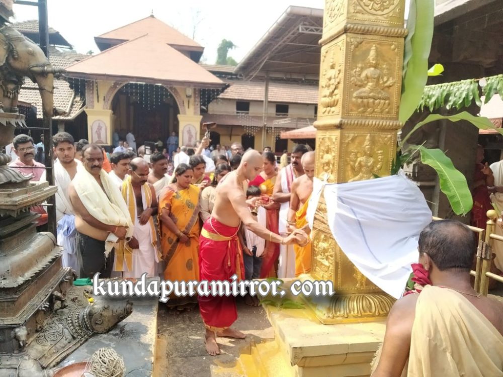 ಕುಂದಾಪುರ : ಮಾ.18 ರಿಂದ 27 ರವರೆಗೆ ನಡೆಯಲಿರುವ ಕೊಲ್ಲೂರಿನ ಮೂಕಾಂಬಿಕಾ ದೇವಸ್ಥಾನದ ಜಾತ್ರಾ ಉತ್ಸವಕ್ಕಾಗಿ ಶುಕ್ರವಾರ ಬೆಳಿಗ್ಗೆ ದೇವಸ್ಥಾನದ ಅರ್ಚಕ ಹಾಗೂ ತಂತ್ರಿ ಕೆ.ರಾಮಚಂದ್ರ ಅಡಿಗ ಅವೆ ನೇತ್ರತ್ವದಲ್ಲಿ ಗಣಪತಿ ಪ್ರಾರ್ಥನೆ, ನಾಂದಿ ಪುಣ್ಯಾಹ, ಅಂಕುರಾವಾಸ ಸಿಂಹ ಯಾಗವನ್ನು ನಡೆಸಿ, 10 ಗಂಟೆಯ ವೃಷಭ ಲಗ್ನ ಮಹೂರ್ತದಲ್ಲಿ ಧ್ವಜ ಮರಕ್ಕೆ ಧ್ವಜಾರೋಹಣ ನೆರವೇರಿಸುವ ಮೂಲಕ ಚಾಲನೆ ನೀಡಲಾಯಿತು.