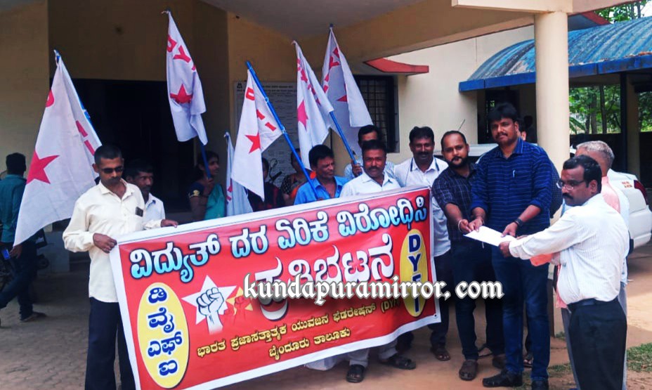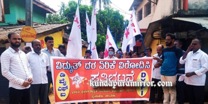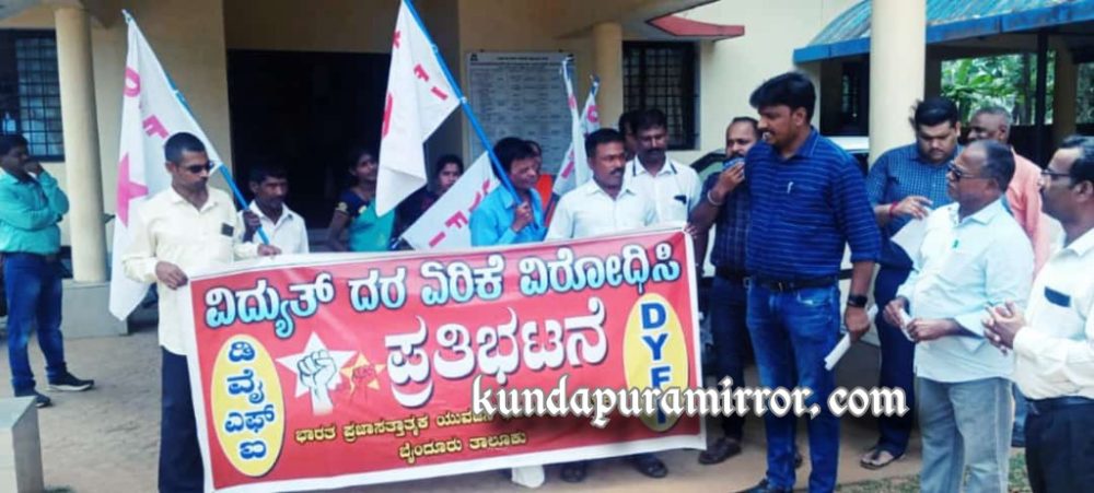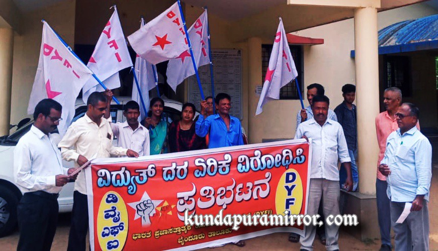 ಬೈಂದೂರು: ಭಾರತ ಪ್ರಜಾಸತ್ತಾತ್ಮಕ ಯುವಜನ ಫೆಡರೇಷನ್(ಡಿವೈಎಫ್ಐ)ರಾಜ್ಯ ಸಮಿತಿ ಕರೆಯಂತೆ ಸರಕಾರ ವಿದ್ಯುತ್ ದರ ಏರಿಕೆ ಖಂಡಿಸಿ,ಡಿವೈಎಫ್ಐ ಬೈಂದೂರು ತಾಲೂಕು ಸಮಿತಿ ನೇತೃತ್ವದಲ್ಲಿ ಮೆಸ್ಕಾಂ ಬೈಂದೂರು ಕಚೇರಿ ಎದುರು ಇಂದು ಬೃಹತ್ ಪ್ರತಿಭಟನೆ ಜರುಗಿತು.