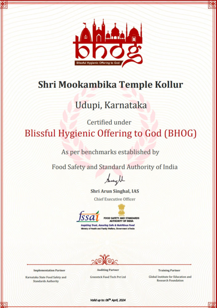 ಈ ಎಲ್ಲಾ ಮುನ್ನೆಚ್ಚರಿಕಾ ಕ್ರಮಗಳನ್ನು ಕೈಗೊಂಡು , ಕೊಲ್ಲೂರು ಶ್ರೀ ಮೂಕಾಂಬಿಕ ದೇವಾಲಯಕ್ಕೆ ಆಗಮಿಸುವ ಭಕ್ತಾದಿಗಳಿಗೆ ಅತ್ಯಂತ ಪರಿಶುದ್ದ, ಸುರಕ್ಷಿತ ಮತ್ತು ಗುಣಮಟ್ಟದ ಭೋಜನ ಪ್ರಸಾದವನ್ನು ನೀಡಲಾಗುತ್ತಿದ್ದು, ಭಾರತ ಸರ್ಕಾರದ ಆಹಾರ ಸುರಕ್ಷತೆ ಮತ್ತು ಗುಣಮಟ್ಟ ಪ್ರಾಧಿಕಾರದ ಮುಖ್ಯ ಕಾರ್ಯನಿರ್ವಾಹಕ ಅಧಿಕಾರಿಗಳು ಈ ಪ್ರಮಾಣಪತ್ರವನ್ನು ನೀಡಿದ್ದಾರೆ.