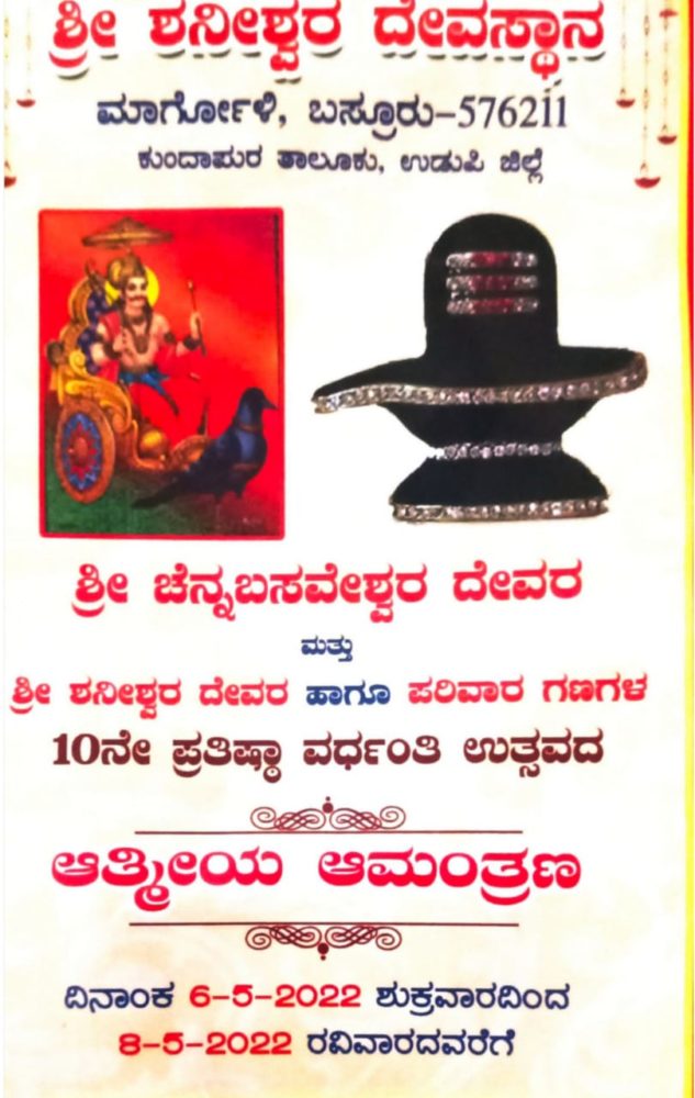 ಕುಂದಾಪುರ: ಬಸ್ರೂರು ಮಾರ್ಗೋಳಿಯ ಶ್ರೀ ಶನೀಶ್ವರ ದೇವಸ್ಥಾನದಲ್ಲಿ ಶ್ರೀ ಚೆನ್ನಬಸವೇಶ್ವರ ದೇವರ ಮತ್ತು ಶ್ರೀ ಶನೀಶ್ವರ ದೇವರ ಹಾಗು ಪರಿವಾರ ಗಣಗಳ 10ನೇ ಪ್ರತಿಷ್ಠಾ ವರ್ಧಂತಿ ಉತ್ಸವ ಮೇ.6 ರಿಂದ 8ರ ತನಕ ನಡೆಯಲಿದೆ.