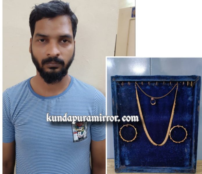 ತನಿಖೆ ಮುಂದುವರಿಸಿದ ಪೊಲೀಸರು ಬೈಂದೂರು ಉಪ್ಪುಂದ ನಿವಾಸಿ ಶ್ರೀಧರ್ ಮಡಿವಾಳ (38) ಎಂಬಾತನನ್ನು ಬಂಧಿಸಿದ್ದು, ಕಳವು ಮಾಡಿದ್ದ ಚಿನ್ನದ ಬಳೆಗಳು, ಚಿನ್ನದ ಸರ ಮತ್ತು ಚಿನ್ನದ ಉಂಗುರವನ್ನು ಒಟ್ಟು 3 ಲಕ್ಷ ರೂ. ಅನ್ನು ವಶಕ್ಕೆ ಪಡೆದುಕೊಂಡಿದ್ದಾರೆ.