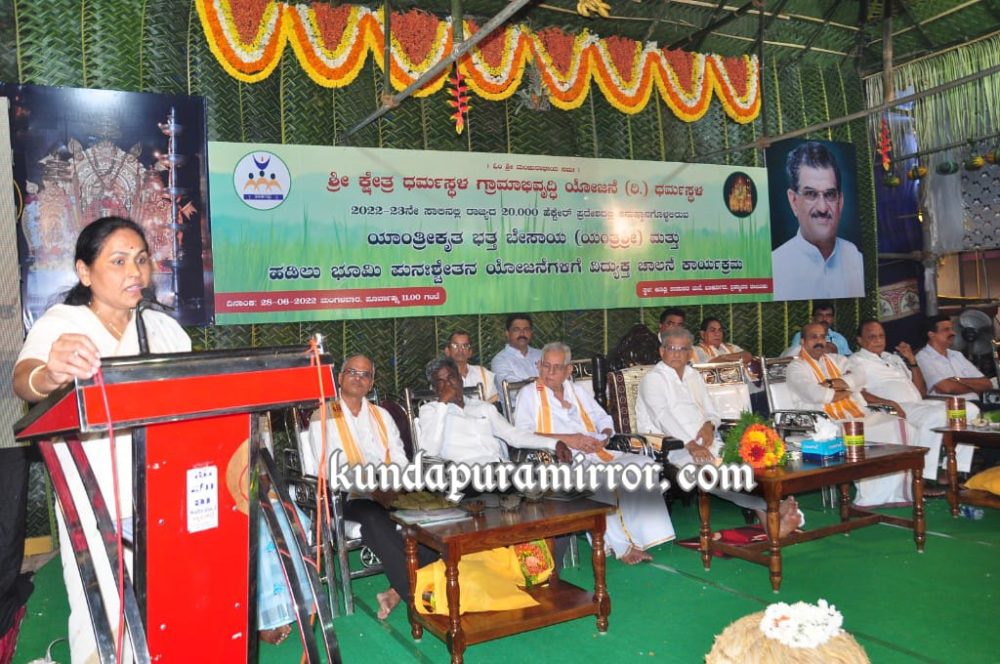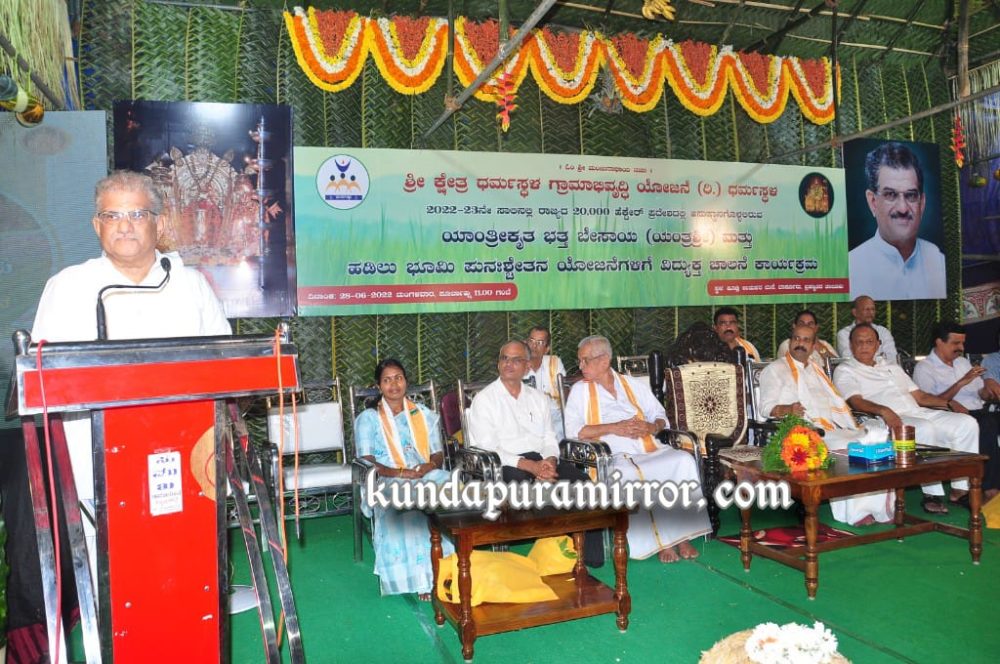 ಬಾರಕೂರು ಕೂಡ್ಲಿ ಉಡುಪರ ಮನೆ ವಠಾರದಲ್ಲಿ ಜರಗಿದ ಶ್ರೀ ಕ್ಷೇ.ಧ.ಗ್ರಾ.ಯೋಜನೆ 2022-23ನೇ ಸಾಲಿನಲ್ಲಿ ರಾಜ್ಯದ 20000 ಹೆಕ್ಟೇರ್ ಪ್ರದೇಶದಲ್ಲಿ ಅನುಷ್ಠಾನಗೊಳ್ಳಲಿರುವ ಯಾಂತ್ರೀಕೃತ ಭತ್ತ ಬೇಸಾಯ (ಯಂತ್ರಶ್ರೀ) ಮತ್ತು ಹಡಿಲು ಭೂಮಿ ಪುನಶ್ಚೇತನ ಯೋಜನೆಗಳಿಗೆ ಕಾರ್ಯಕ್ರಮ ಉದ್ಘಾಟಿಸಿ ಮಾತನಾಡಿದರು.