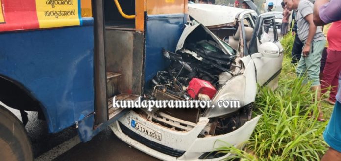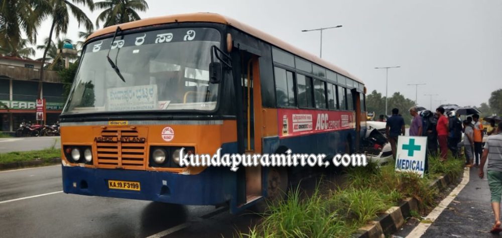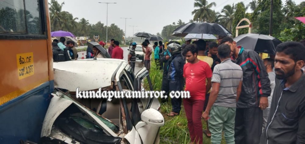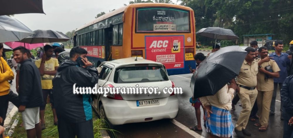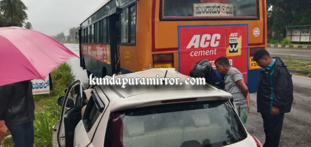 ಉಡುಪಿ ಜಿಲ್ಲೆಯ ಬೈಂದೂರು ತಾಲೂಕಿನ ನಾವುಂದದಲ್ಲಿ ಚಲಿಸುತ್ತಿದ್ದ ಬಸ್ಗೆ ಕುಂದಾಪುರದಿಂದ ಭಟ್ಕಳ ಕಡೆ ಸಾಗುತ್ತಿದ್ದ ಕಾರು ಹಿಂಬದಿಯಿಂದ ಡಿಕ್ಕಿ ಹೊಡೆದಿದೆ.