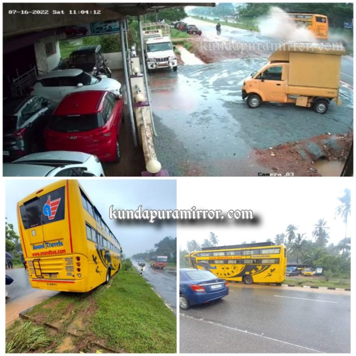 ಕುಂದಾಪುರ: ಕುಂದಾಪುರ ಮಂಗಳೂರು ರಾಷ್ಟ್ರೀಯ ಹೆದ್ದಾರಿಯ ಕುಂಭಾಶಿ ಬಳಿ ಸುಮಾರು 2 ಅಡಿ ಆಳದ ಹೊಂಡ ನಿರ್ಮಾಣವಾಗಿದೆ. ಈ ಹೊಂಡವು ಮಳೆ ನೀರಿನಿಂದ ವಾಹನ ಸವಾರರಿಗೆ ಕಾಣದೇ ಬಸ್ಸೊಂದು ಎರಡು ಅಡಿ ಹೊಂಡಕ್ಕೆ ಬಸ್ ಇಳಿದ ಪರಿಣಾಮ ಚಾಲಕನ ನಿಯಂತ್ರಣ ಕಳೆದುಕೊಂಡು 300 ಮೀಟರ್ ದೂರ ಡಿವೈಡರ್ ಮೇಲೆ ಚಲಿಸಿದ ಘಟನೆ ತಾಲೂಕಿನ ಕುಂಭಾಸಿ ಸಮೀಪದ ಕೊರವಡಿ ಕ್ರಾಸ್ ಬಳಿ ಶನಿವಾರ ನಡೆದಿದೆ.