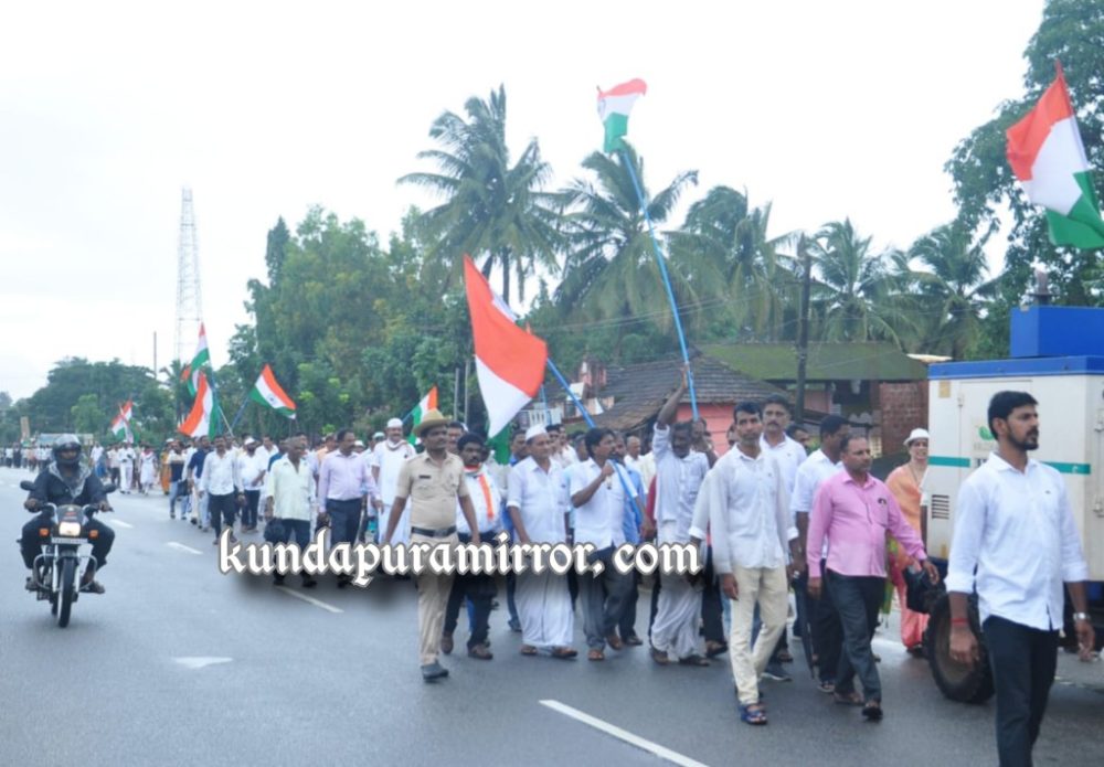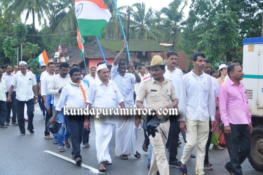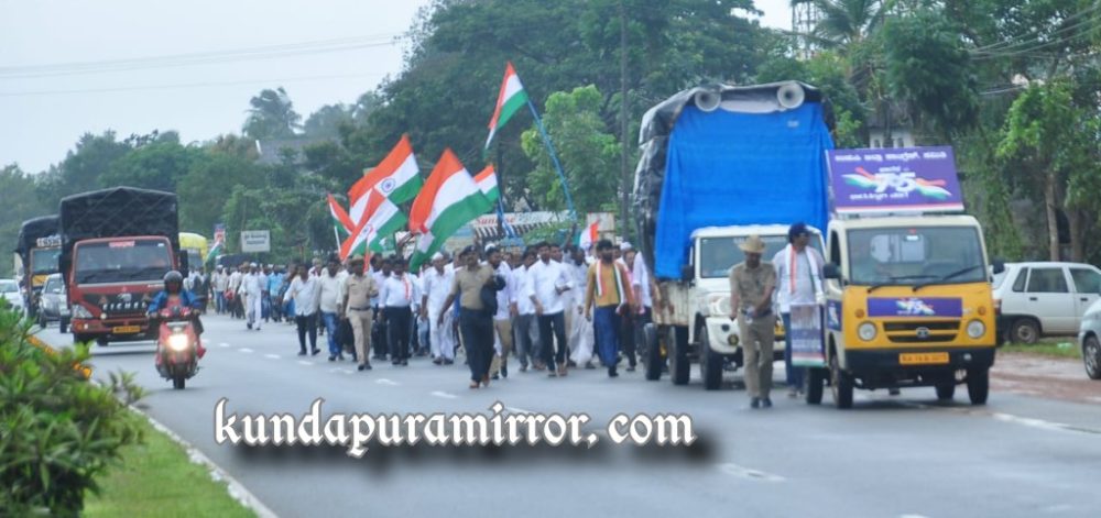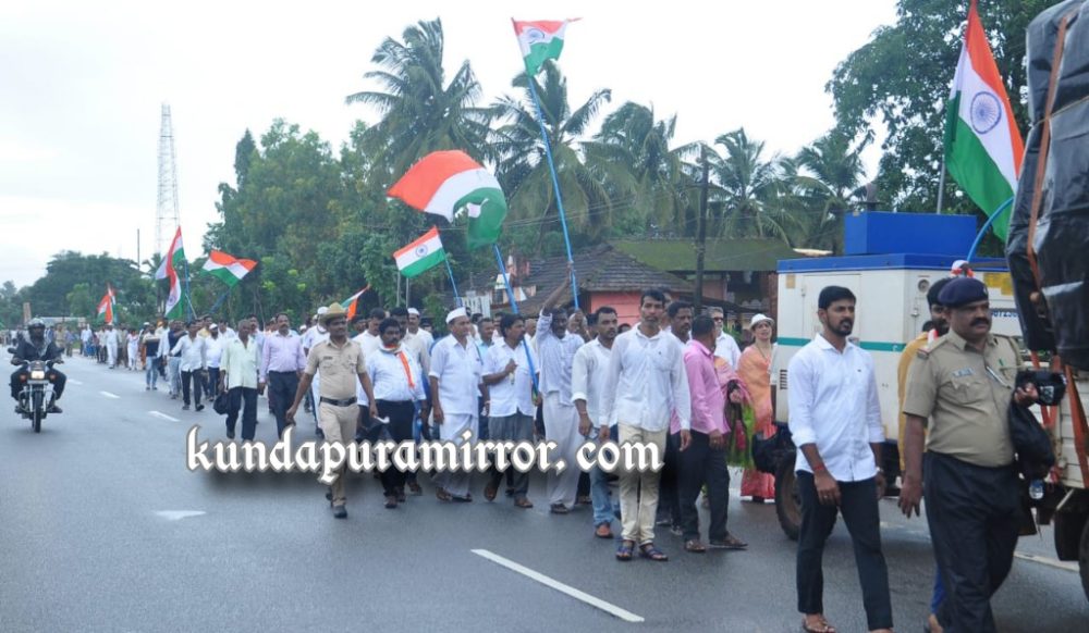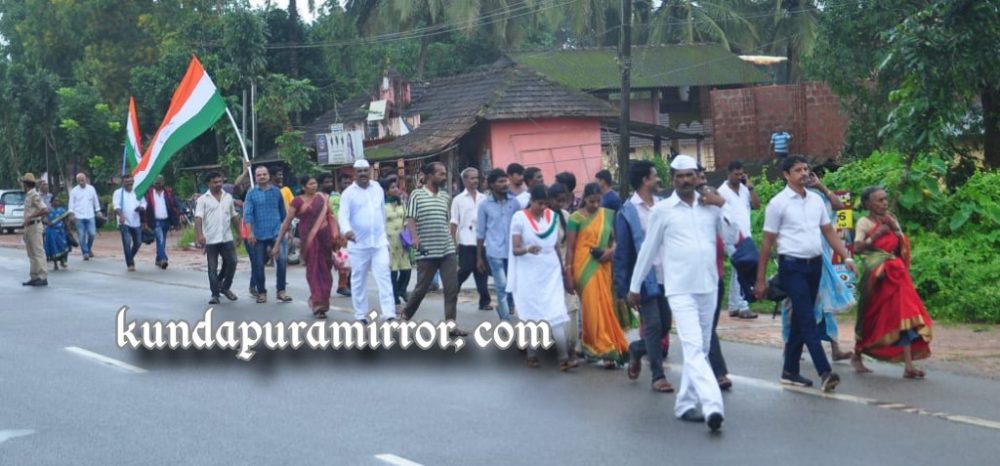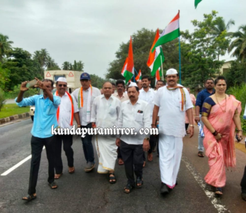ಕೋಟ ಹಾಗೂ ಕುಂದಾಪುರ ಬ್ಲಾಕ್ ಕಾಂಗ್ರೆಸ್ ವತಿಯಿಂದ 75 ನೇ ಸ್ವಾತಂತ್ರ್ರೋತ್ಸವದ ಅಮೃತಮಹೋತ್ಸವ ಅಂಗವಾಗಿ ಸ್ವಾತಂತ್ರ್ಯ ಸಂಗ್ರಾಮದಲ್ಲಿ ವೀರ ಯೋಧರ ತ್ಯಾಗ ಬಲಿದಾನವನ್ನು ನೆನಪಿಸುವ ಹಾಗೂ ಶಾಂತಿ ಸಾಮರಸ್ಯದ ದೇಶಪ್ರೇಮದ ಸಂದೇಶವನ್ನು ಸಾರುವ ಸಲುವಾಗಿ ಸಾಲಿಗ್ರಾಮದಿಂದ ಕೋಟ ಮಾರ್ಗವಾಗಿ ತೆಕ್ಕಟ್ಟೆವರೆಗೆ ಹಮ್ಮಿಕೊಂಡ ಕಾಲ್ನಡಿಗೆ ಜಾಥಾ ಕಾರ್ಯಕ್ರಮದಲ್ಲಿ ಮಾತನಾಡಿದ ಅವರು, ಸ್ವಾತಂತ್ರ್ಯೋತ್ಸವದ ಕುರಿತಾಗಿ ಹಮ್ಮಿಕೊಂಡ ಹರ್ ಘರ್ ತಿರಂಗ ಘೋಷಿಸಲು ಬಿಜೆಪಿಗೆ ನೈತಿಕತೆ ಇಲ್ಲ ಜನಸಾಮಾನ್ಯರ ಸ್ವಾತಂತ್ರ್ಯವನ್ನೇ ಕಸಿದು ಆಡಳಿತ ನಡೆಸುವ ಪಕ್ಷ ಸ್ವಾತಂತ್ರದ ಬಗ್ಗೆ ಉಲ್ಲೇಖಿಸುವುದು ಅದರ ಕುರಿತು ಕಾರ್ಯಕ್ರಮ ಆಯೋಜಿಸುವುದು ಎಷ್ಟು ಸೂಕ್ತ. ಕಾಂಗ್ರೆಸ್ ಸ್ವಾತಂತ್ರ್ಯಕ್ಕೆ ಬಹುದೊಡ್ಡ ಕೊಡುಗೆ ನೀಡಿದೆ. ಅದರ ಜೊತೆಗೆ ಕಳೆದ 60ವರ್ಷಗಳಿಂದ ಸಂವಿಧಾನ ಬದ್ಧವಾದ ಆಡಳಿತ ನಡೆಸಿಕೊಂಡು ಬಂದಿದೆ. ಬಡವರ ಬಗ್ಗೆ ಕಾಳಜಿ ಕಾರ್ಯಕ್ರಮಗಳನ್ನು ಸದಾ ನೀಡಿದೆ. ಬಿಜೆಪಿ ಗಾಂಧಿ ಹತ್ಯೆಗೈದ ಗೋಡ್ಸೆ ದೇವಾಲಯ ಕಟ್ಟಲು ಶ್ರಮಿಸುತ್ತದೆ, ನೆಹರು,ಇಂದಿರಾ,ರಾಜೀವ್ ಗಾಂಧಿ ಹೀಗೆ ಹಲವು ನಾಯಕರುಗಳು ಈ ದೇಶಕ್ಕಾಗಿ ಸದಾ ಶ್ರಮಿಸಿದ ನಾಯಕರುಗಳು ಆದರೆ ಇಂಥಹ ಮಹಾನ್ ನಾಯಕರಗಳ ಬಗ್ಗೆ ಈಗಿನ ಆಡಳಿತ ಪಕ್ಷ ಗುಬೆ ಕುರಿಸುವ ಕೆಲಸ ನಿರಂತರವಾಗಿ ಮಾಡುತ್ತಿದೆ ಎಂದರು.