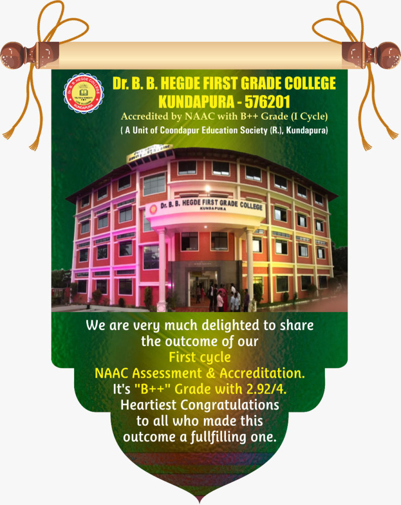 ಕುಂದಾಪುರ : ಕುಂದಾಪುರ ಎಜುಕೇಶನ್ ಸೊಸೈಟಿ(ರಿ.) ಪ್ರವರ್ತಿತ ಕುಂದಾಪುರದ ಪ್ರತಿಷ್ಠಿತ ಶಿಕ್ಷಣ ಸಂಸ್ಥೆಯಾದ ಡಾ| ಬಿ.ಬಿ. ಹೆಗ್ಡೆ ಪ್ರಥಮ ದರ್ಜೆ ಕಾಲೇಜಿಗೆ ಯುಜಿಸಿ “ನ್ಯಾಕ್” ಸಂಸ್ಥೆಯು “B++” ಗ್ರೇಡ್ ಮಾನ್ಯತೆ ನೀಡಿದೆ. ಹೊಸ ಮಾನ್ಯತಾ ಕ್ರಮದಲ್ಲಿ ಸಿಜಿಪಿಎ 2.92/4 ಸಂಸ್ಥೆ ಪಡೆದಿದ್ದು, ಮಂಗಳೂರು ವಿ.ವಿ. ವ್ಯಾಪ್ತಿಗೆ ಒಳಪಟ್ಟಿರುವ ಅನುದಾನ ರಹಿತ ಶಿಕ್ಷಣ ಸಂಸ್ಥೆಯೊಂದು ಕೇವಲ 11 ವರ್ಷಗಳಲ್ಲಿ ಮಾಡಿದ ಸಾಧನೆಗೆ ಮೊಟ್ಟ ಮೊದಲ ಬಾರಿಗೆ B++ ಗ್ರೇಡ್ ಬಂದಿರುವುದು ಬಹಳ ವಿಶೇಷವಾಗಿದೆ ಎಂಬುದಾಗಿ ಕಾಲೇಜು ಪ್ರಕಟಣೆಯಲ್ಲಿ ತಿಳಿಸಿದೆ.