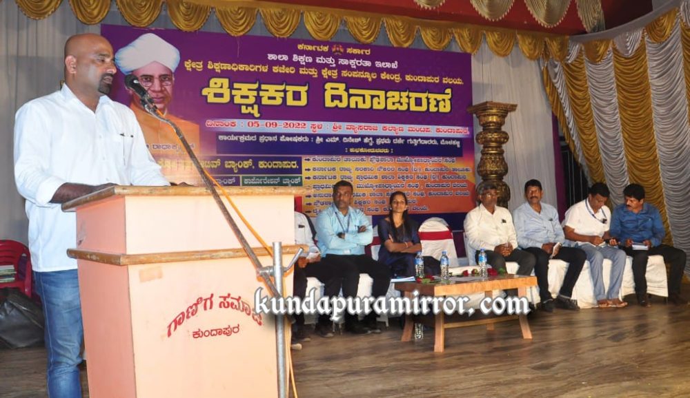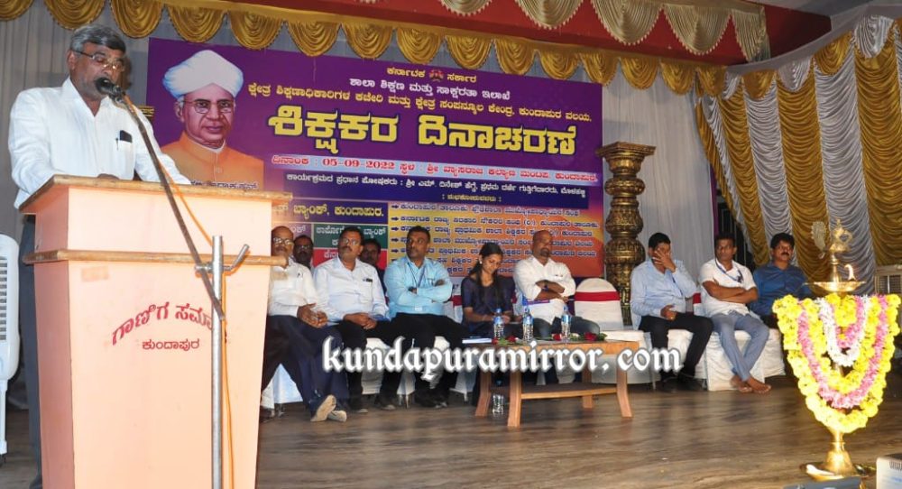 ಅವರು ಸೋಮವಾರ ಕುಂದಾಪುರದ ಶ್ರೀ ವ್ಯಾಸರಾಜ ಕಲ್ಯಾಣ ಮಂಟಪದಲ್ಲಿ ನಡೆದ ಶಾಲಾ ಶಿಕ್ಷಣ ಮತ್ತು ಸಾಕ್ಷರತಾ ಇಲಾಖೆ, ಕ್ಷೇತ್ರ ಶಿಕ್ಷಣಾಧಿಕಾರಿಗಳ ಕಚೇರಿ ಕುಂದಾಪುರ ಮತ್ತು ಕ್ಷೇತ್ರ ಸಂಪನ್ಮೂಲ ಕೇಂದ್ರದ ಸಹಯೋಗದಲ್ಲಿ ಹಮ್ಮಿಕೊಂಡಿದ್ದ ಶಿಕ್ಷಕರ ದಿನಾಚರಣೆ ಮತ್ತು ಸನ್ಮಾನ ಕಾರ್ಯಕ್ರಮವನ್ನು ಉದ್ಘಾಟಿಸಿ ಮಾತನಾಡಿದರು.