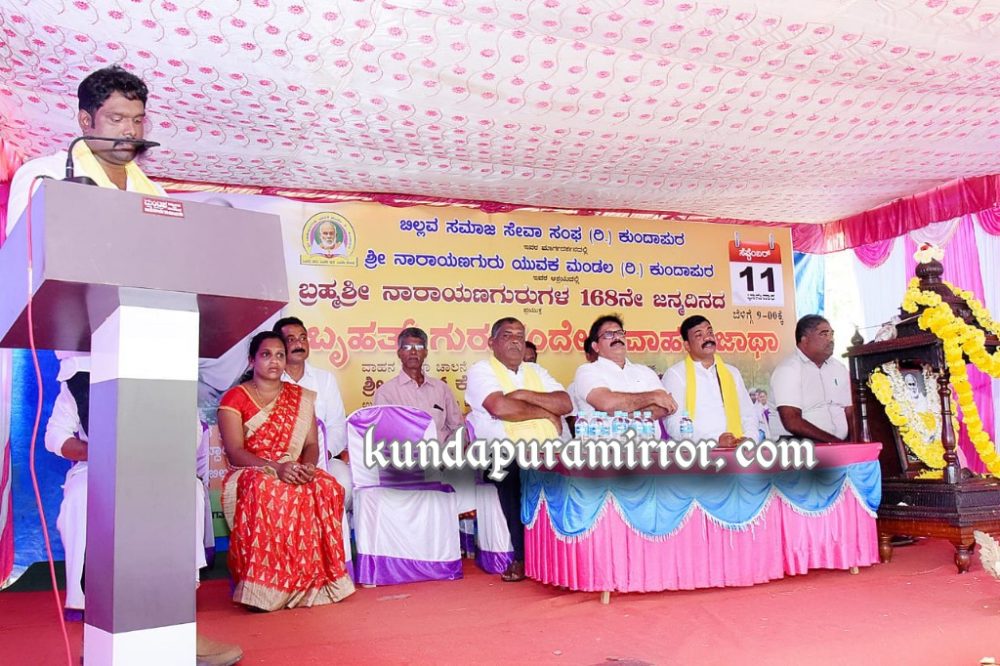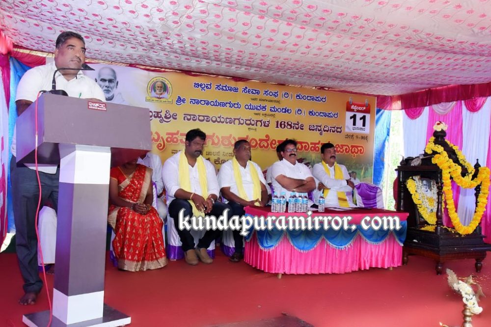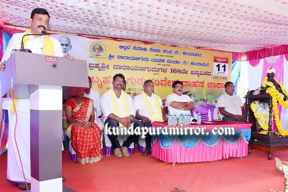 ಭಾನುವಾರ ಬಿಲ್ಲವ ಸಮಾಜ ಸೇವಾ ಸಂಘ ಕುಂದಾಪುರ ಮಾರ್ಗದರ್ಶನದಲ್ಲಿ ಶ್ರೀ ನಾರಾಯಣ ಗುರು ಯುವಕ ಮಂಡಲ ಕುಂದಾಪುರ ಆಶ್ರಯದಲ್ಲಿ ಬ್ರಹ್ಮಶ್ರೀ ನಾರಾಯಣ ಗುರುಗಳ 168ನೇ ಜನ್ಮ ದಿನದ ಪ್ರಯುಕ್ತ ಹಮ್ಮಿಕೊಳ್ಳಲಾದ ಬೃಹತ್ ಗುರು ಸಂದೇಶ ವಾಹನ ಜಾಥಾ ಮತ್ತು ಗುರುವಂದನೆ ಕಾರ್ಯಕ್ರಮದಲ್ಲಿ ಮಾಧ್ಯಮದೊಂದಿಗೆ ಮಾತನಾಡಿದರು.