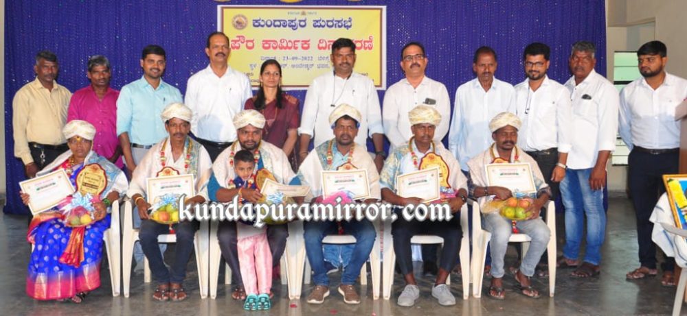 ಪೌರ ಕಾರ್ಮಿಕರಾಗಿ ಸೇವೆ ಸಲ್ಲಿಸಿ ನಿವೃತ್ತರಾದ ಸತೀಶ, ಬಾಲಕೃಷ್ಣ, ಡೆನ್ನಿಸ್ ಗೋತಾ, ಚಂದ್ರಶೇಖರ ಹಾಗೂ ಘನ ತ್ಯಾಜ್ಯ ವಿಲೇವಾರಿ ಘಟಕದಲ್ಲಿ ಸೇವೆ ಸಲ್ಲಿಸುತ್ತಿರುವ ದ್ಯಾವಮ್ಮ, ರವಿ, ಸಿದ್ದಾರ್ಥ, ಪ್ರಶಾಂತ, ಗುರುರಾಜ, ಕೃಷ್ಣ ಅವರನ್ನು ಸನ್ಮಾನಿಸಲಾಯಿತು.