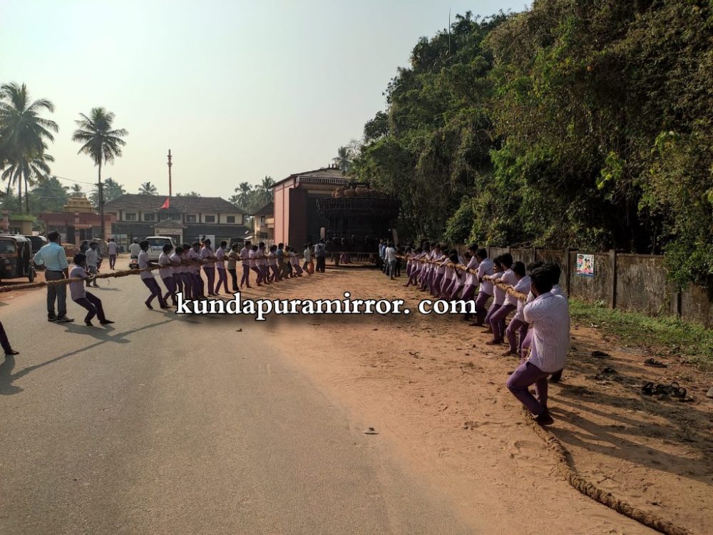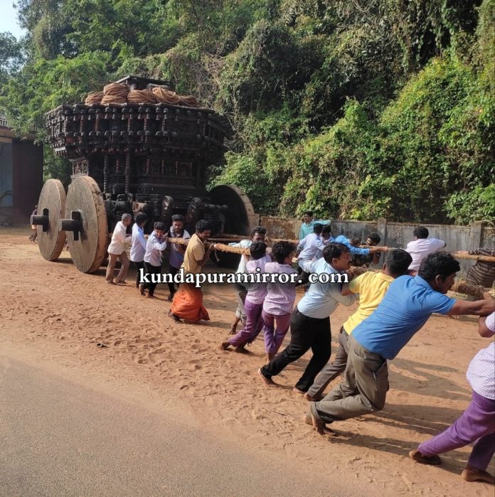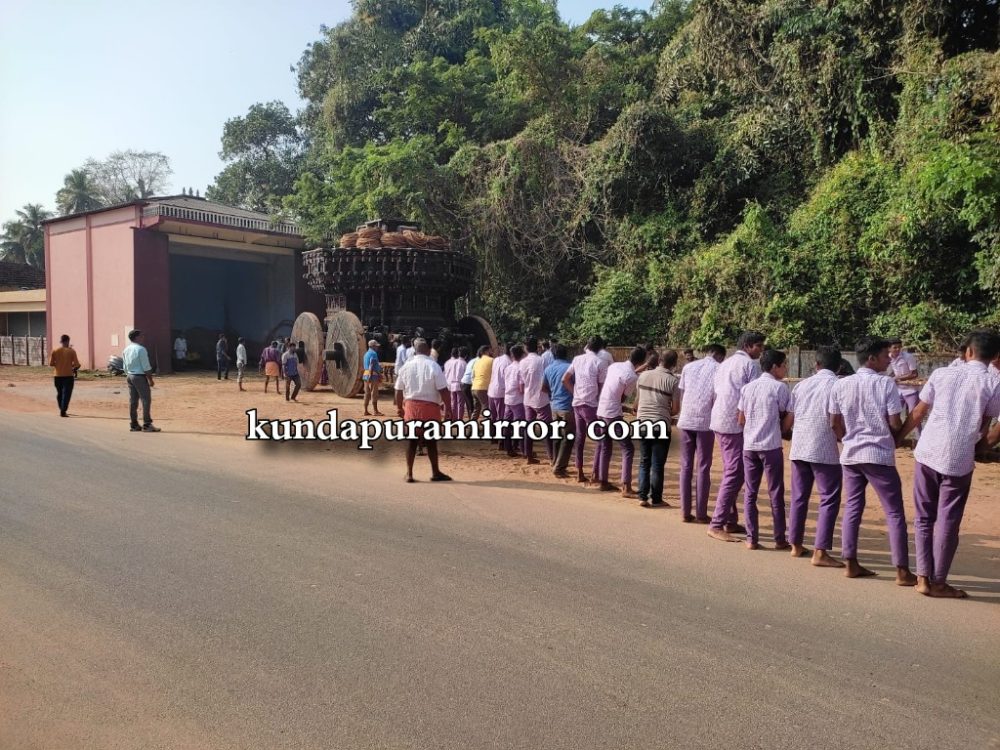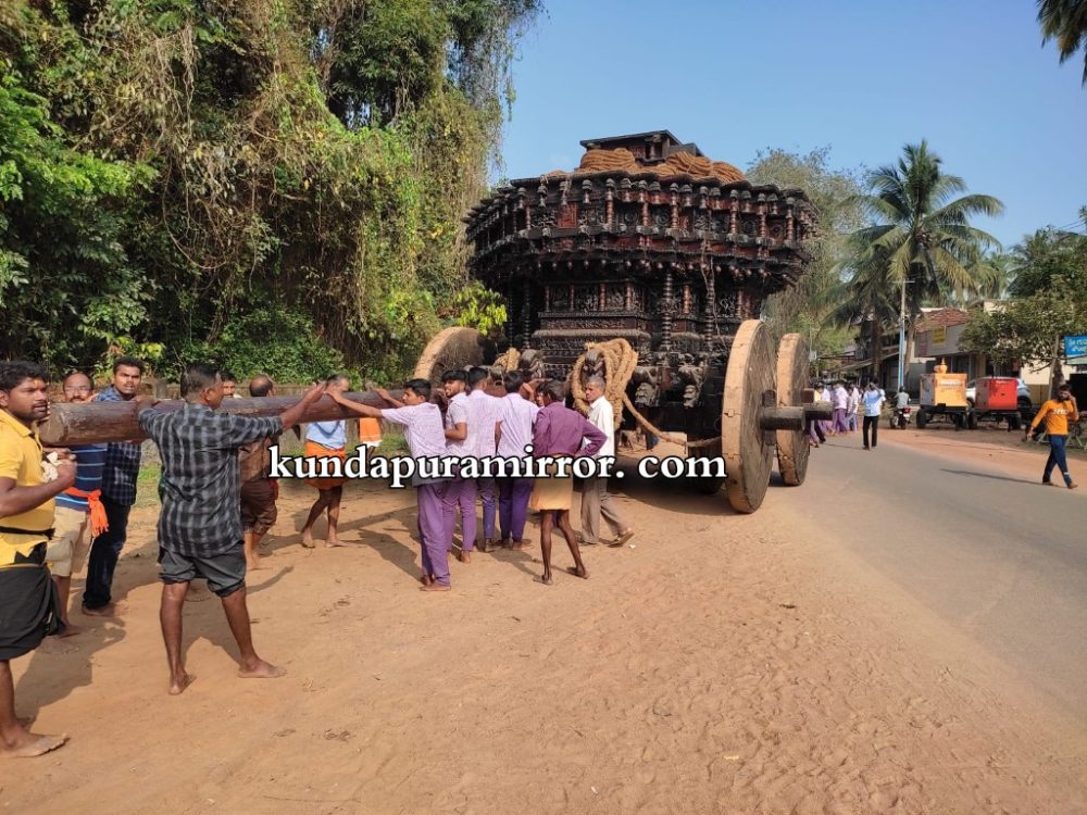 ಗುರುವಾರ ಸಂಜೆ ಶ್ರೀ ಮೂಲೆ ಗಣಪತಿ, ಶ್ರೀ ಪಾರ್ವತಿ ಸಹಿತ ಶ್ರೀ ಕೋಟಿಲಿಂಗೇಶ್ವರ ಮತ್ತು ಪರಿವಾರ ದೇವರುಗಳ ಪ್ರಾರ್ಥನೆಯೊಂದಿಗೆ ರಥಾಲಯದಿಂದ ರಥವನ್ನು ಹೊರಗೆಳೆದು ತರುವ ಕಾರ್ಯ ನಡೆಸಲಾಯಿತು. ದೇವಳ ತಂತ್ರಿ ವೇದಮೂರ್ತಿ ಪ್ರಸನ್ನ ಕುಮಾರ್ ಐತಾಳರ ನಿರ್ದೇಶನ, ವ್ಯವಸ್ಥಾಪನಾ ಸಮಿತಿ ಅಧ್ಯಕ್ಷ ಎಂ. ಪ್ರಭಾಕರ ಶೆಟ್ಟಿ, ಸದಸ್ಯ ಸುರೇಶ್ ಬೆಟ್ಟಿನ್ ರವರ ಉಸ್ತುವಾರಿಯಲ್ಲಿ ಸಾರ್ವಜನಿಕ ಭಕ್ತಾಭಿಮಾನಿಗಳು, ಕಾಲೇಜು ವಿದ್ಯಾರ್ಥಿಗಳು ರಥ ಹೊರಗೆಳೆಯುವಲ್ಲಿ ಕೈ ಜೋಡಿಸಿದರು.