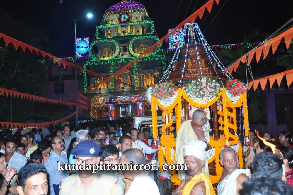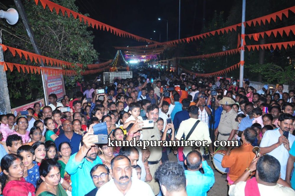 ನಂತರ ಪುಷ್ಪಕ ರಥದಲ್ಲಿ ವೈಭವದ ಪುರಮೆರವಣಿಗೆ ನಡೆಯಿತು. ಬಗೆ-ಬಗೆಯ ಆಕರ್ಷಣೆಗಳು. ನಾಗಸ್ವರವಾದನ, ಸಾಂಪ್ರದಾಯಿಕ ವಾದ್ಯ, ಜಾನಪದ ನೃತ್ಯಗಳು ವಿಶೇಷ ಆಕರ್ಷಣೆಯಾಗಿತ್ತು. ಶ್ರೀ ದೇವರ ಉತ್ಸವ ದೇವಾಲಯದಿಂದ ಹೊರಟು, ಹೊಸ ಬಸ್ಸ್ಟಾಂಡ್ ಬಳಿ ತಿರುಗಿ, ಪುರಸಭೆಯ ರಸ್ತೆ ಮತ್ತು ರಾಷ್ಟ್ರೀಯ ಹೆದ್ದಾರಿಯ ಮೂಲಕ ಹಂಗ್ಳೂರು ಗೆಳೆಯರ ಬಳಗದವರೆಗೂ ಹೋಗಿ, ನಂತರ ಬೆಳಗಿನ ಜಾವ ದೇವಾಲಯದ ರಥಬೀದಿಯ ಕಡೆಗೆ ಆಗಮಿಸಿದರು.