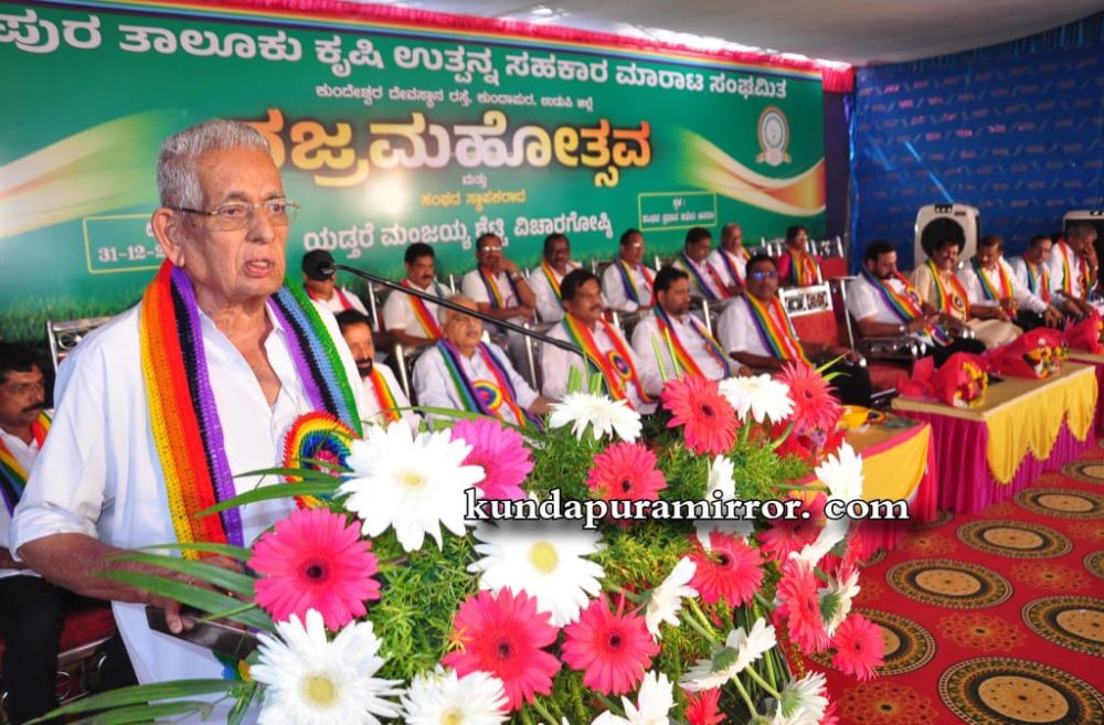 ಕುಂದಾಪುರ: ಸಹಕಾರಿ ಸಂಘಗಳು ಜನಸಾಮಾನ್ಯರ ಶ್ರೇಯೋಭಿವೃದ್ಧಿಗೆ ಶ್ರಮಿಸಿದಾಗ ಸಹಕಾರಿ ಉದ್ಧೇಶ ಈಡೇರುತ್ತದೆ ಎಂದು ಮಾಜಿ ಶಾಸಕ, ಧಾರ್ಮಿಕ ಮುಂದಾಳು, ಕುಂದಾಪುರ ತಾಲೂಕು ಕೃಷಿ ಉತ್ಪನ್ನ ಸಹಕಾರ ಮಾರಾಟ ಸಂಘದ ಮಾಜಿ ಅಧ್ಯಕ್ಷ ಬಿ. ಅಪ್ಪಣ್ಣ ಹೆಗ್ಡೆ ಹೇಳಿದರು. ಅವರು ಶನಿವಾರ ಕುಂದಾಪುರ ತಾಲೂಕು ಕೃಷಿ ಉತ್ಪನ್ನ ಸಹಕಾರ ಮಾರಾಟ ಸಂಘದ ವಜ್ರಮಹೋತ್ಸವವನ್ನು ಸಂಘದ ಆವರಣದಲ್ಲಿ ನಡೆದ ಸಮಾರಂಭದಲ್ಲಿ ಉದ್ಘಾಟಿಸಿ, ಮಾತನಾಡಿದರು.
